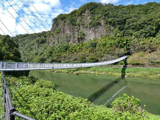 これから「鷹栖つり橋」を渡って「鷹栖観音堂」へと向かいます。吊り橋の向こうには断崖絶壁が見えていますが、ここは古くから「小耶馬渓」や「鷹栖の仙境」と呼ばれる景勝地だったそうです。