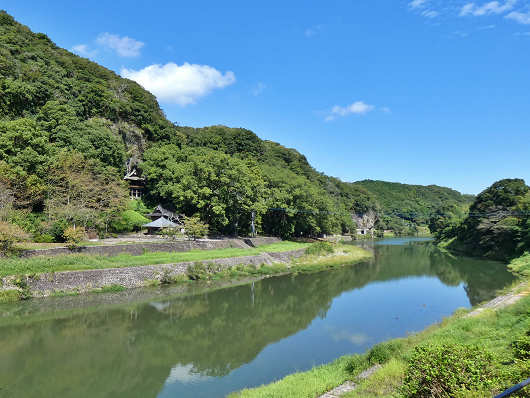公園の駐車場から眺めた川の対岸の景色です。対岸の山腹には「鷹栖観音堂」が小さく見えています。