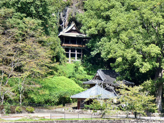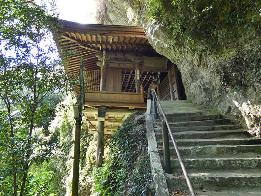 石段の途中から眺めた鷹栖観音堂です。離れた位置からでは樹木が生い茂っていてよく分かりませんでしたが、観音堂が建っているのは断崖絶壁に掘られた岩窟の中です。この様な建て方は「懸崖造り(けんがいづくり)」といって日本独特の寺社建築だそうです。