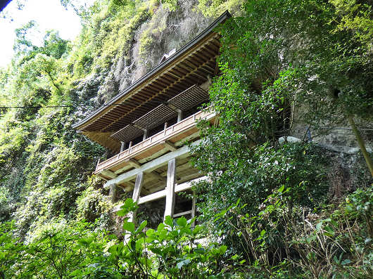 鷹栖観音堂を横から眺めるとこんな感じで、建物の半分ほどは岩窟からはみ出していて、脚のように伸びた長い柱で支えられていました。