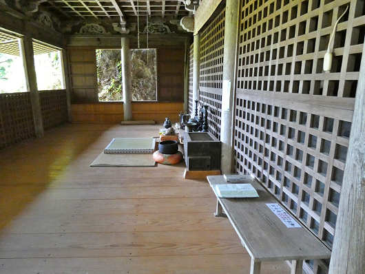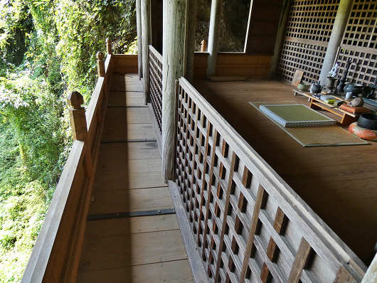 鷹栖観音堂には周り廊下のような狭い通路?もありました。でもこの廊下は岩窟からはみ出した位置にあるので、もしも床板が腐食していたら踏み抜いて崖から真っ逆さまに転落するんですよね。