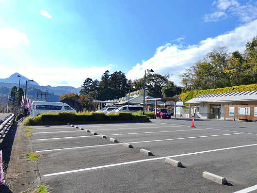道の駅「高千穂」の第二駐車場を除いた全景です。ここは比較的小さな道の駅で、駐車場は普通車が74台と大型車が7台になっていますが、普通車の駐車スペースは半数以上が国道218号を挟んだ反対側の第二駐車場になります。