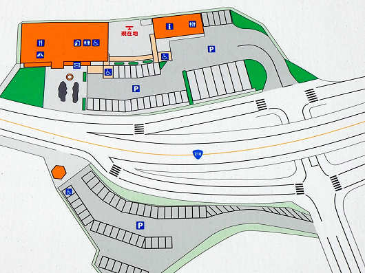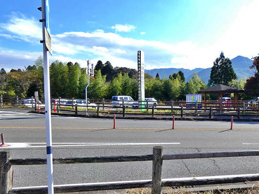 これは物産館の前から撮影した画像です。手前に国道218号が走っていて、その向こうに第二駐車場が見えていますが、この辺りには横断歩道が無いので道路を渡って道の駅には行けないんですよね。