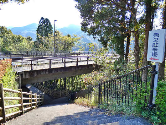 敷地の端っこには道路の下を潜る階段があって、第二駐車場への行き来はこの階段を通ることになります。そしてその上の道路は高千穂峡の深い峡谷のなかでも最も高い位置に架かる「神都高千穂大橋」です。