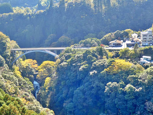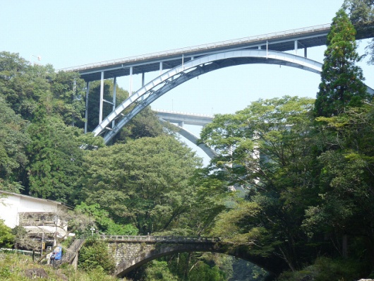 この画像はもう10年以上も前にりゅう君と高千穂峡を訪れた時のものですが、高千穂峡から上を眺めると3つの橋が見えて、一番奥に見える橋が「神都高千穂大橋」です。