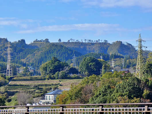 高千穂峡の反対側を眺めるとこの様な景色が見えました。平らな台地のようなところは雲海の名所として有名な「国見ヶ丘」でしょうか?
