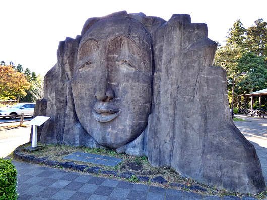 この道の駅の特徴は何といっても物産館の前にある巨大な2体の石像です。どちらも天岩戸伝説に登場する人物で、女性の像は岩戸に隠れた天照大神(あまてらすおおみかみ)を誘い出すために踊った雨鈿女命(あめのうずめのみこと)で、男性の像はわずかに開いた岩戸を力任せに取り払った天手力男命(あまのたぢからおのみこと)です。