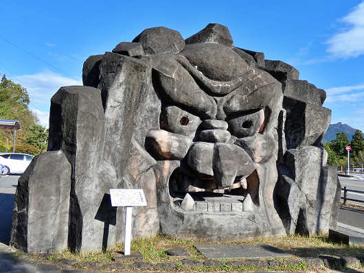 第二駐車場から眺めた道の駅「高千穂」です。よく見ると石造の前で腰をかがめるようにして写真を撮っている人がいますが、石像はその3倍以上も高さがありそうで、石像の大きさがよく分かりますね。