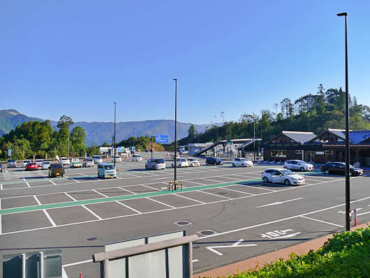 物産館から眺めた駐車場です。駐車場は第一、第二、第三と分かれていて、普通車が107台、大型車が23台停められます。この道の駅は南九州への物流の拠点となるような位置に立地しているので大型車の駐車スペースがかなり広いですが、物産館の前は普通車、大型バスのみが駐車可で、大型車の駐車場は画像では奥になる離れたところにあって、面積はこの第一駐車場と同じくらいなんですよね。