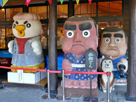 物産館を通り過ぎてL字型に配置された建物の角を曲がると、西郷どん(せごどん)や、愛犬のツン、そして宮崎名物のチキン南蛮のキャラクター「チキなん番長」のモニュメントがありました。