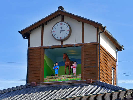 「はゆま物産館」の屋根は時計台のようになっていて、シャッターには馬に乗った2人の子供が描かれていますが、道の駅の名前の由来となった「はゆま」とは、太古の駅制度の時代に駅と駅を結んでいた「早馬」が転じて「はゆま」になったそうです。