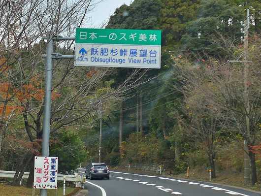 旅行の二日目は大分方面へと北上しながら何ヵ所か訪れる予定ですが、お宿を出発したら初日に通った日南海岸沿いの国道は走らずに、県道28号を山に向かって北上しました。しばらく山の中の道を登って行くと「飫肥杉峠展望台」の標識が見えてきました。