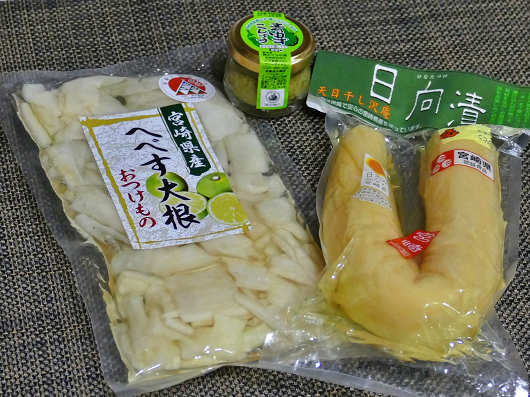 田野町は合併によって今は宮崎市になっていますが、干し大根の生産量が日本一で、宮崎道を走っていても竹で組んだ大根やぐらに多くの大根を干した光景を見ることができます。この道の駅では宮崎県特産の柑橘を使ったへべす大根と、日向漬をお土産に買いました。
