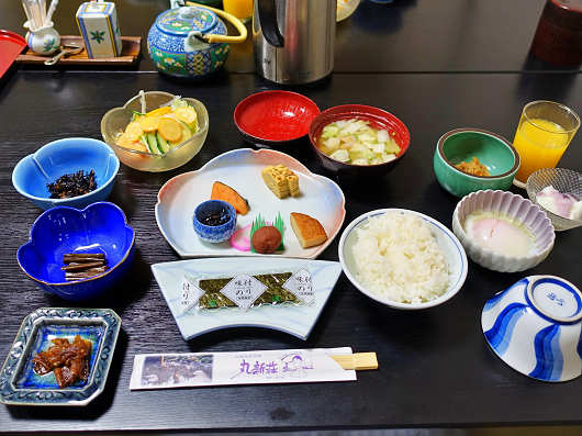 翌朝は朝食前にゆっくりとお風呂に入ってから朝御飯をいただきました。ここの温泉はとてもいい泉質なので本当は食後にもう一度お風呂に入りたかったんですが、この日も訪れる予定のところが多かったので、朝食が終わったらすぐにお宿をチェックアウトをしました。