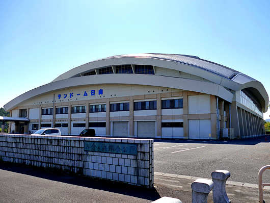 国道10号をしばらく北上すると、行きと同じように日向市街地をバイパスする県道15号を通りますが、交差点を右折して県道15号へ入るとすぐに「サンドーム 日向」と書かれたドーム型の運動施設が見えてきます。