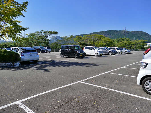 車でお倉ヶ浜総合公園へと入って、いちばん奥まった道路の行き止まりまで進むと、百台以上の車が収容できそうな広い駐車場があるのでここに車を停めました。