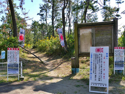駐車場のすぐ前は松林になっていて、松林の中の小径を300mも歩くと、サーフスポットとして有名な全長4kmといわれる広大な砂浜の「お倉ヶ浜」へ出ますが、この時期は例年海上自衛隊のエアクッション艇(LCAC)がビーチング訓練(揚陸訓練)を行っていて、松林の入口にはこの様な看板がいくつも立てられていて、この辺りの海岸はサーフィンが禁止になっているんですよね。