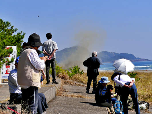 これまでの画像を見るとかなり近くで撮影しているようにも見えますが、実際にはこんな感じで、私は松林を出てすぐのところで撮影をしましたが、マニアっぽい人たちはできるだけ近くで撮影しようと波打ち際まで行っていました。