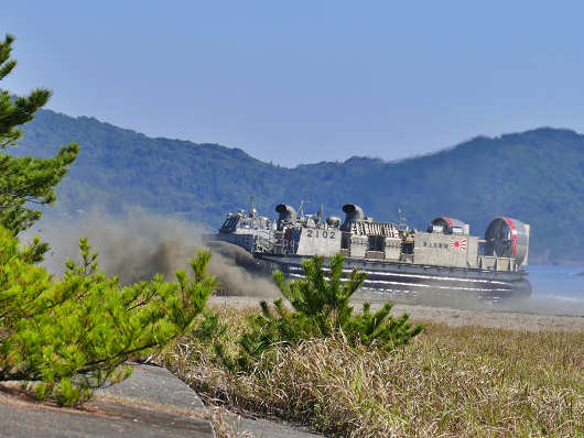 海上へ出たLCACは水しぶきを上げながら沖合へと向かって行きますが、同じホバークラフトでも先日ブログに載せた大分空港と大分市を結ぶホーバー「バイエン」とは随分迫力が違いますね。