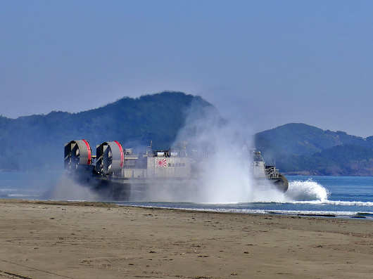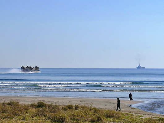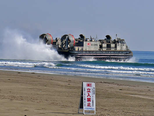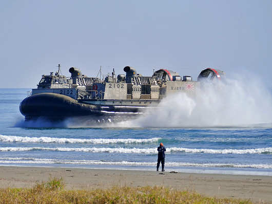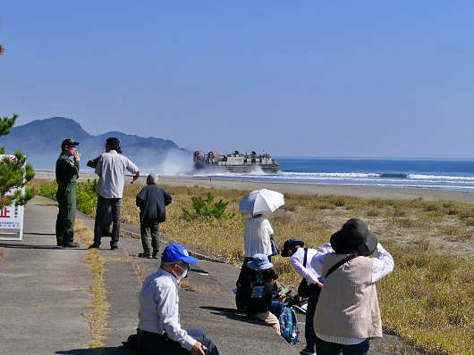 沖合から戻って来て間もなく上陸するLCACです。LCACのすぐ近くの立入禁止区域内には人が立っていますが、この人は自衛隊の広報の人で盛んに写真を撮っていました。