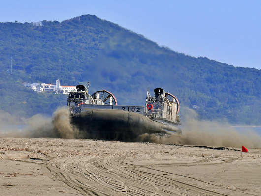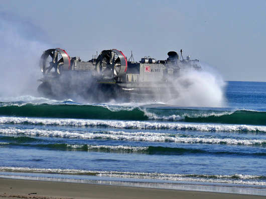 波打際から沖合に向かって進むLCACです。LCACの前方からは勢いよく水しぶきが上がり、後方からは砂煙が舞い上がっています。