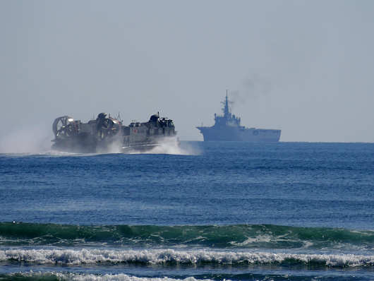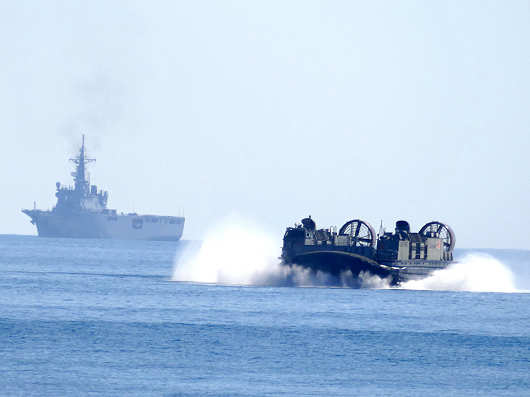 艇首を海に向けたLCACはあっという間に陸地から海上へと出て行って、これからビーチング訓練の開始です。
