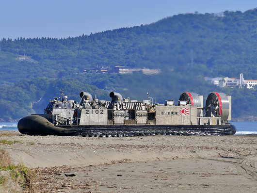 いつもは2艇でビーチング訓練をするLCACですが、この時は艇№2102の1艇だけでの訓練でした。輸送艦「しもきた」には2艇のLCACが収納できるので、もう1艇は整備中だったんでしょうか?