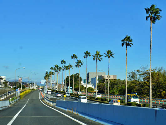 宮崎ICで東九州道を降りたら一般道を南へ向かって走りましたが、道路の中央分離帯にはヤシの木がズラリと植えられていて、真冬とは思えない南国ムード満点の景色でした。