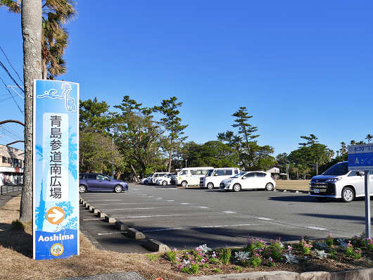 私たちが車を停めたのは「青島参道南広場」駐車場です。ここは市営の無料駐車場で、青島のすぐ近くにあるとても便利な駐車場です。でも早い時間に来ないとすぐに満車になるんですよね。無料駐車場はここ以外にも150mほど離れたJR青島駅の周囲にもあります。