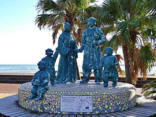 駐車場の前にはとても広い芝生広場があって、波打ち際近くには日本神話のモニュメントが建っています。中央に立っているのはニニギノミコトとコノハナサクヤヒメの夫婦で、その周囲にいる子供はホオリ(山幸彦)、ホデリ(海幸彦)、ホスセリだそうです。