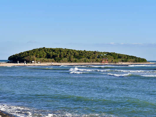 そして波打ち際へ行ってみると、島全体が亜熱帯植物のビロウ樹に包まれた青島が目の前に見えました。