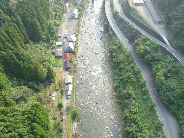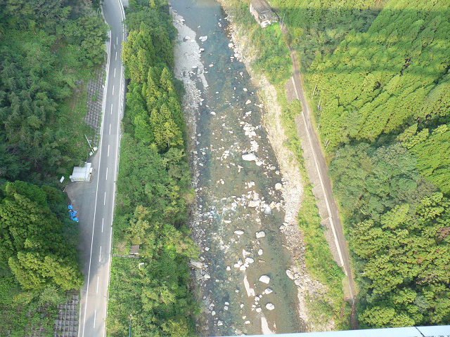 橋の中央付近まで来たので下を覗いて見ると、川底がはるか下に見えました、青雲橋は川面からの高さが137mあって、さっき見た天翔橋の143mには敵わないけど、国道に架かってる橋としては東洋一なんだって、すごいよね、でも国道橋なのに東洋一っておかしくない?