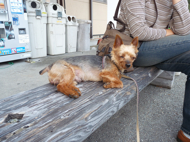 りゅう君は長距離ドライブと橋の往復でちょっと疲れたからベンチでひと休みです、でもりゅう君はもうすでにお休みモードで目が開いていません。