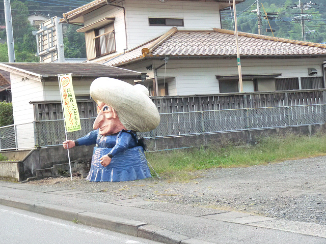 再び高千穂へ戻り、熊本県の高森町を目指して走っていると変なおばあちゃんの置物が交通安全の幟を持っていました、でもこのおばあちゃん誰だったっけ?