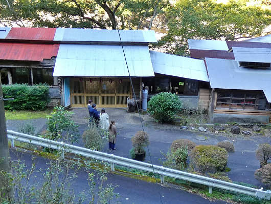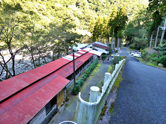 県道28号からお食事処を眺めると、横に細長い平屋の建物が川沿いに建っていて、建物の前は渓流の本庄川が流れていました。