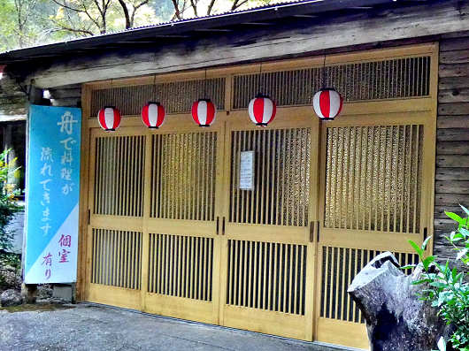 ここがお食事処の入口です。看板には「舟で料理が流れてきます」と書かれていました。