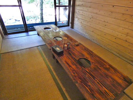 細長い建物は真ん中辺りが厨房になっていて、その両側にお食事処があります。こちらはとても広い大広間のようなところに小上がり席とテーブル席がある部屋(建物?)ですが・・・