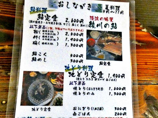 席に座ったらさっそく料理の注文です。ここは定食メニューは鮎定食と地どり定食の2種類だけで、りゅうママはいつも地どり定食を注文していましたが、今回は私もりゅうママも鮎定食を注文して、単品で鮎の塩焼きを追加注文しました。