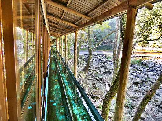 そして窓から外を眺めると渓流の本庄川が見えて、すぐ足元には建物の幅いっぱいに作られた水路のようなものがあって水が流れていました。