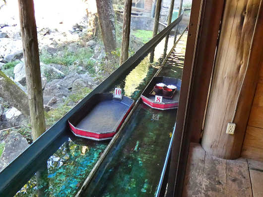 注文が終わったら部屋番号が書かれた舟で料理が流れてくるのを待ちます。私たちの部屋は5番なので、画像は別のお客さんの料理ですが、8番は料理が乗って部屋へと流れて行く舟で、10番はお客さんが料理を受け取って空で厨房へ戻って行く舟です。