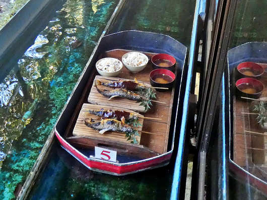 この時はほとんどのお客さんが地どり定食を注文していたので、5番の舟はなかなか来なくて他の部屋の料理を眺めてばかりでしたが(笑)しばらくするとようやく5番の舟がやって来ました。地どり定食はお客さんが肉を焼くので生肉で早く運ばれますが、鮎定食は厨房で鮎を焼いてから運ばれるので時間がかかるんでしょうね。