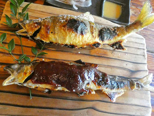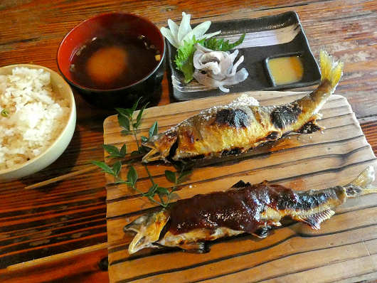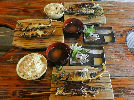 私とりゅうママの注文した鮎定食です。左側の鮎2匹は追加で注文した鮎の塩焼きです。