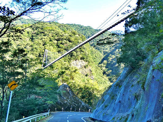 綾町からは県道26号を走ってさらに内陸部(山奥?)へと進みましたが、綾町の町中を過ぎてしばらくすると民家も無い渓谷沿いの山道となって、頭上には大きな吊り橋が見えてきました。この吊り橋がこの日最初の目的地の「照葉大吊橋(てるは おおつりばし)」です。