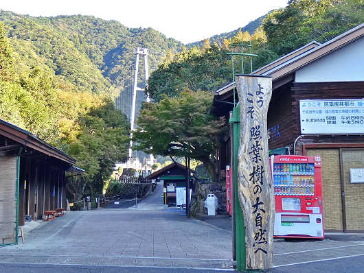 ここが照葉大吊橋の入口です。入口付近には「ようこそ照葉樹の大自然へ」と書かれた大きな木柱が立てられていました。照葉樹は常緑広葉樹の一種ですが、熱帯の大きな葉っぱをした常緑広葉樹と区別するために温帯の常緑広葉樹を照葉樹と呼ぶそうです。