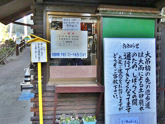これから受付で入園料500円を払って大吊橋へと向かいます。受付の横にはお知らせと書かれた看板が立てられていて、大吊橋を渡った先の遊歩道は通行止めになっているようでした。延岡水郷鮎やなが流失した10月21,22日の大雨の影響なんでしょうね?