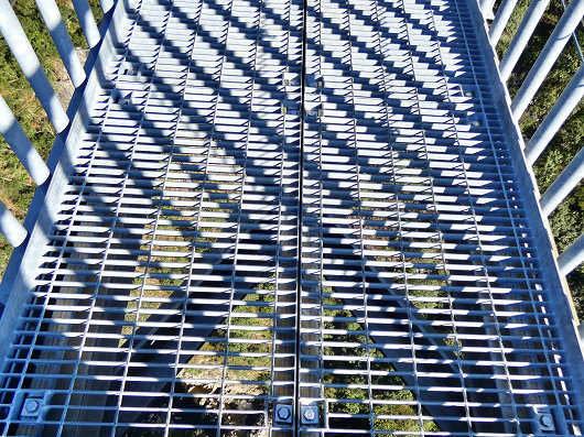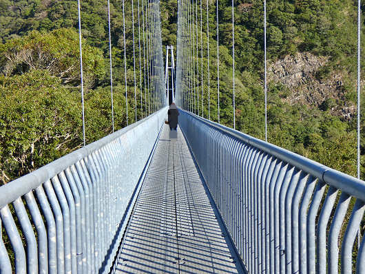 歩行部分の一部はこの様に下が透けて見える網状になっているので、吊橋の幅の狭さと相まってスリリングさが倍増なんですよね(笑)