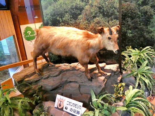 館内には照葉樹林に関する様々な説明や展示物があって、入口付近には国の天然記念物に指定されているニホンカモシカの剥製もありました。ニホンカモシカは東北地方などでは分布域が広がって農業被害も出ているそうですが、九州では宮崎、熊本、大分に生息するニホンカモシカは生息数を減らし続けていて準絶滅危惧種に指定されているそうです。