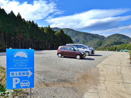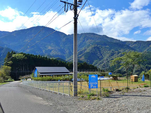 国道218号を横切って少し狭い道を1㎞ほど進むと、りゅうママのお目当てのスイーツのお店が前方に見えてきました。フェンスの手前にも広い駐車場(空き地?)がありましたが、目的のお店はフェンスの向こうに見えている建物なのでもう少し先へ進みました。