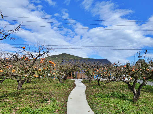 駐車場の前には果樹園が広がっていて、この時季は柿がたわわに実っていて、果樹園の中には細い舗装路が奥に見える建物へと続いていたのでここを奥へと進みました。
