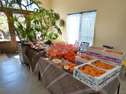 カフェ エンチャードは田口ファミリーファームという果樹園が経営するカフェなので、この時季は果樹園で収穫されたたくさんの柿が入口付近に並べられていました。